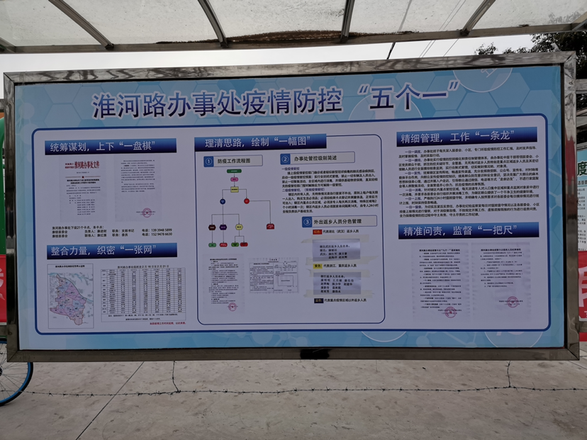 淮河路辦事處地處我市東南部,總?cè)丝诩s4萬。轄區(qū)黃灘、孟營、鄭洼、牛灘、劉新莊、姚灘、南徐、路莊、趙寨、麥仁店、康樓、徐莊等12個居委會,有34個自然村,114個村民組,人口約39000人、面積20平方公里。根據(jù)轄區(qū)的實疫情防控工作,淮河路辦事處探索出一套疫情防控工作“五個一”流程。統(tǒng)籌謀劃,上下“一盤棋”; 整合力量,織密“一張網(wǎng)”; 理清思路,繪制“一幅圖”;精細(xì)管理,工作“一條龍”;精準(zhǔn)問責(zé),監(jiān)督“一把尺”。