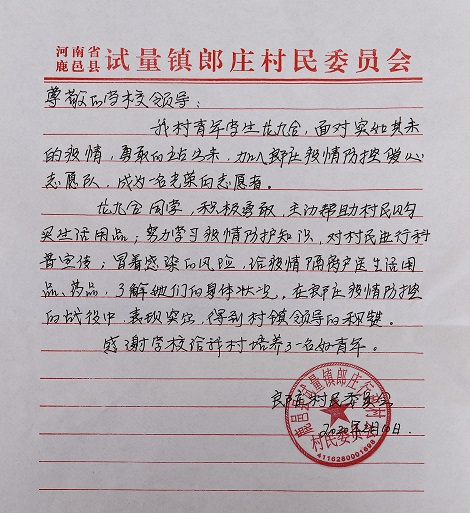 “龍九合同學(xué)積極勇敢,主動幫村民購買生活用品,努力學(xué)習(xí)疫情防護知識,對村民進行科普宣傳,冒著感染的風(fēng)險給疫情隔離戶送生活用品、藥品,在我村疫情防控的戰(zhàn)役中表現(xiàn)突出,得到村鎮(zhèn)領(lǐng)導(dǎo)的稱贊,感謝學(xué)校給我們培養(yǎng)了一名好青年……”這是一封要寄往周口師范學(xué)院的感謝信,落款為鹿邑縣試量鎮(zhèn)郎莊行政村村民委員會。