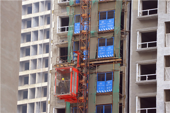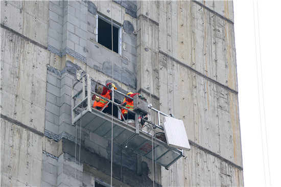 當日上午,記者在施工現場看到,樓體外部,工人們隨著升降吊籃的上下正在緊張有序地進行外墻保溫施工;樓體內,工人們正在進行內墻的粉刷及水泥地板的鋪設,里里外外一派忙碌的景象。