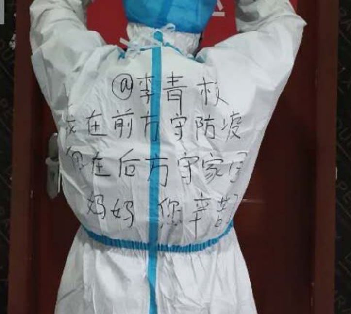“我在前方守疫,你在后方守家園”,李慧在防護(hù)服上寫下感謝媽媽的話,心疼婆婆幫忙照顧孩子。