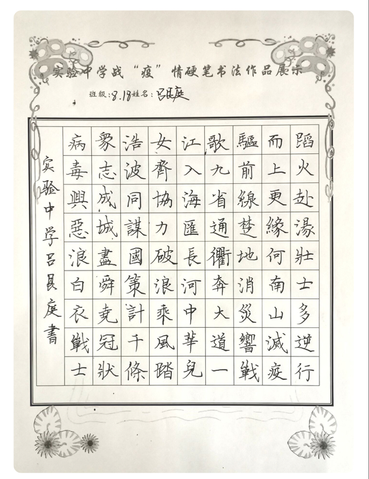 “赴湯蹈火壯士多,逆行而上更緣何。南山滅疫驅(qū)前線,楚地消災(zāi)響戰(zhàn)歌。九省通衢奔大道,一江入海匯長(zhǎng)河。中華兒女齊協(xié)力,破浪乘風(fēng)踏浩波......”扶溝縣實(shí)驗(yàn)中學(xué)“萬眾一心 抗擊新冠”硬筆書法比賽中,八(18)班呂艮庭同學(xué)鄭重地抄錄了這首律詩。