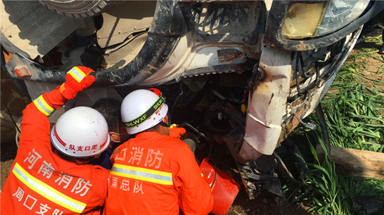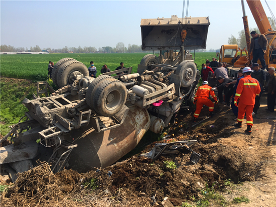 4月7日9時許,沈丘縣李老鄉(xiāng)劉堂村附近一輛攪拌車翻入溝內(nèi),司機人被困。接到報警后,沈丘縣消防救援大隊立即出動前往救援。