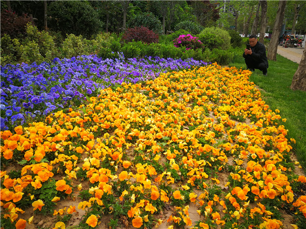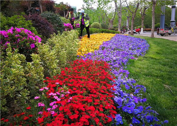 4月20日,在文昌大道道路綠化帶上,市政工人正在為栽種的花卉綠植補充水分。入春以來,我市城區(qū)一直在進行美化綠化,現(xiàn)在各個街道逐漸顯現(xiàn)出絢麗身姿。市民走在市區(qū)的每個街道都能看到各色花卉、綠植,很是養(yǎng)眼。