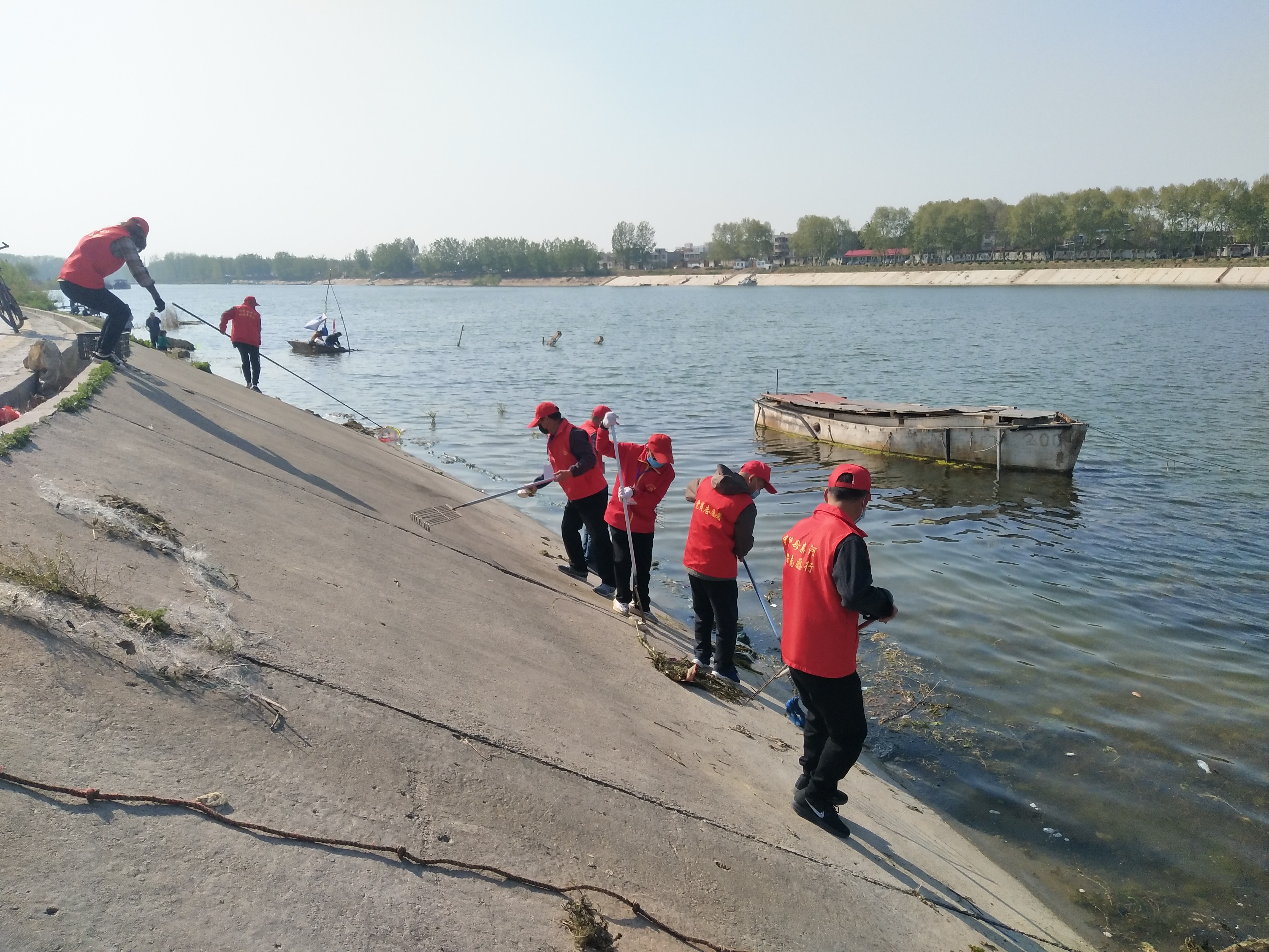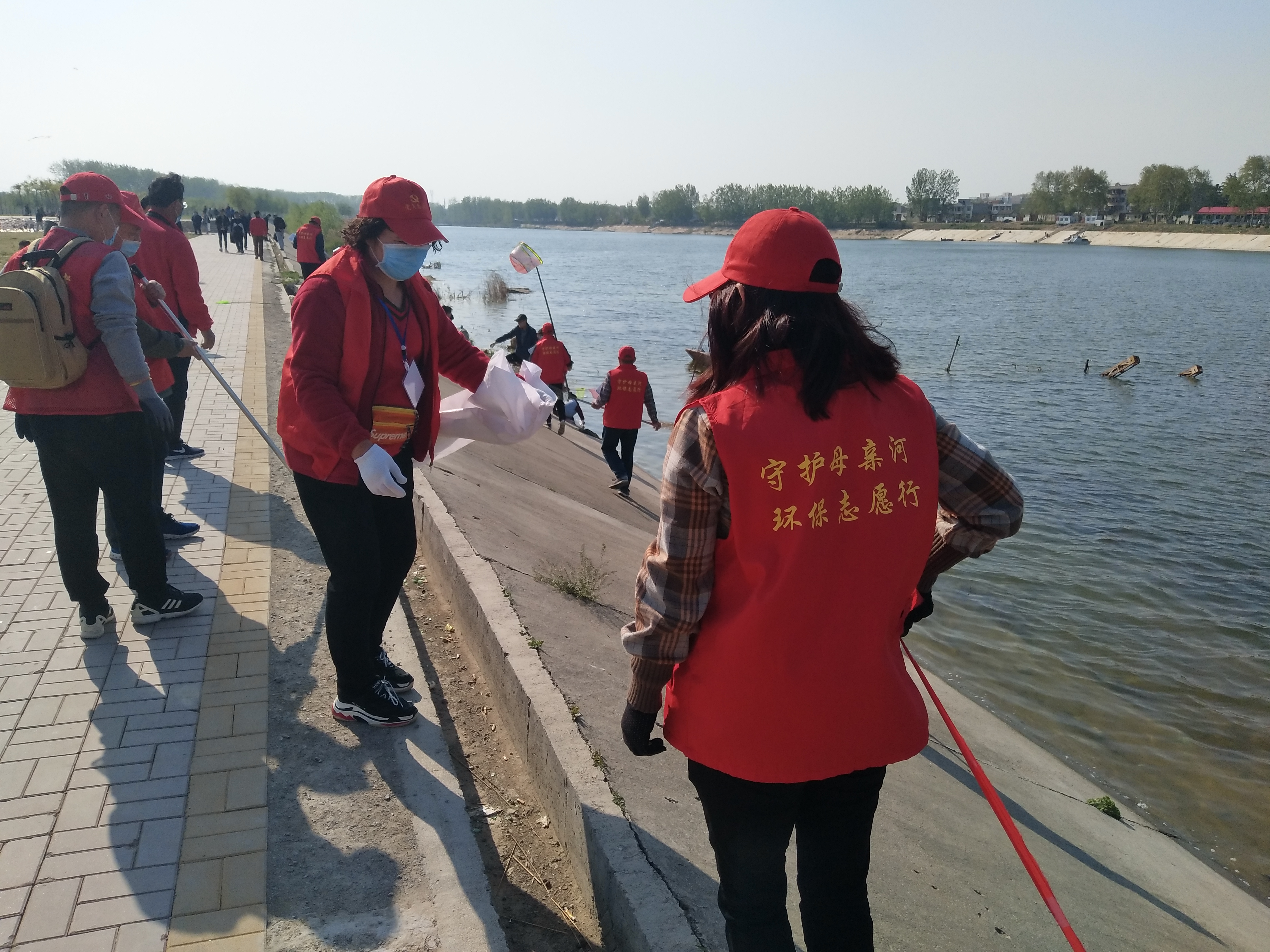 問(wèn)卷棚旁是擺放整齊的河面垃圾清理工具,鐵锨、鐵耙、繩索、編織袋、掃帚、垃圾箱一字排開,寫有“川匯區(qū)巡河護(hù)河”、“志愿者服務(wù)總隊(duì)”字樣的紅旗迎風(fēng)飛揚(yáng)。記者向志愿者借了身衣服,和大家一起等著護(hù)河總指揮孫彩云分工。