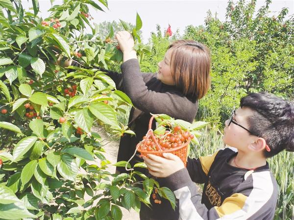 4月26日,在淮陽區(qū)豆門鄉(xiāng)武灣村的櫻桃采摘園內,人們享受著采摘的樂趣。武灣村農民利用地理優(yōu)勢種植櫻桃、草莓等,吸引附近的民眾前來采摘,成為當?shù)氐奶厣a業(yè)。記者 孫安平 攝