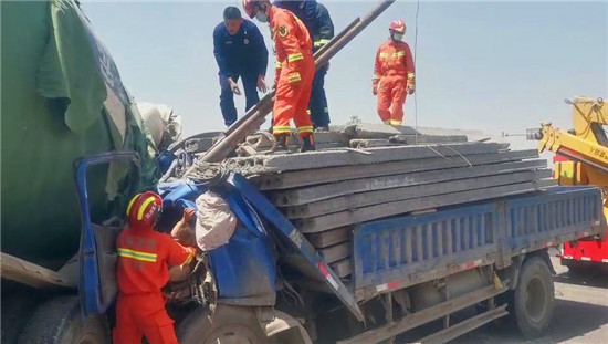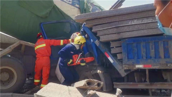 4月26日11時(shí)許,西華縣逍遙鎮(zhèn)加河灘村穎河橋發(fā)生一起車禍,一輛拉石板的貨車和一輛水泥罐車相撞,貨車在強(qiáng)大的慣性下車頭嚴(yán)重變形,司機(jī)被困車中,而貨車的駕駛室也被由于慣性發(fā)生前傾的石板壓住,情況十分緊急。周口市消防救援支隊(duì)西華縣消防大隊(duì)接到報(bào)警后立即出動(dòng)2車10人趕赴現(xiàn)場(chǎng)展開救援。