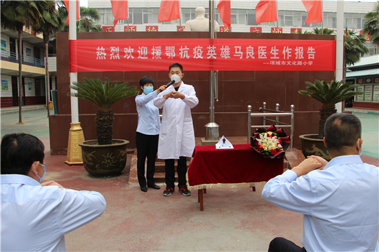 為彰顯榜樣力量,傳承抗“疫”精神,5月6日,項(xiàng)城市文化路小學(xué)邀請(qǐng)項(xiàng)城援鄂抗“疫”英雄代表項(xiàng)城市中醫(yī)院脾胃肝膽科護(hù)士馬良來校為廣大師生作報(bào)告,講述戰(zhàn)“疫”背后的故事,厚植愛國(guó)主義情懷。