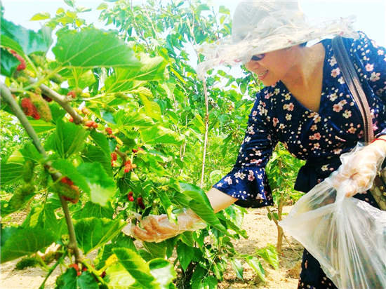 眼下正是桑葚陸續(xù)成熱的好時節(jié)。黃泛區(qū)農(nóng)場郭莊村鷹虎寶百畝桑椹園,一排排桑樹枝頭上,掛滿了或青或紅或紫的桑葚。紫黑桑葚放入口中,輕輕一咬,甜甜酸酸的味道瞬間在口中蔓延開來,讓人忍不住想多嘗幾顆。