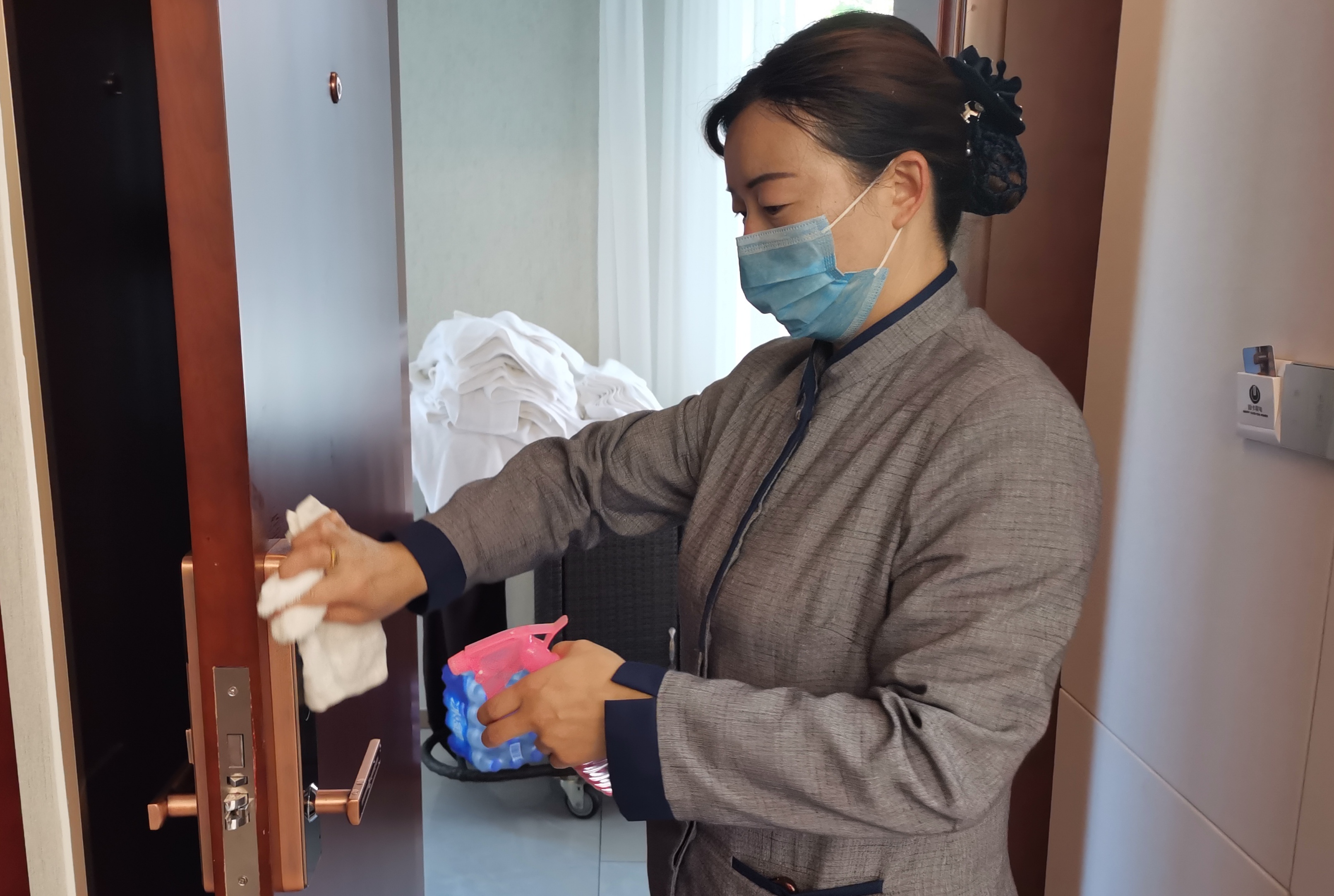 5月10日,記者在“兩會”駐地酒店看到,酒店工作人員不時對客房和公共場所、會議室進(jìn)行消毒、擦拭。受疫情影響,“兩會”駐地酒店工作人員認(rèn)真和精心準(zhǔn)備,加強(qiáng)了對代表、委員駐地消殺防疫,還貼心地放置了一次性電梯按鍵專用紙、酒精等物品。