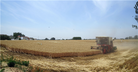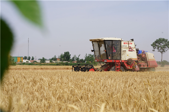 5月28日,在周口市西華縣遲營鄉(xiāng)前喜村,農民駕駛收割機在田間收割小麥。 眼下,周口市近千萬畝小麥陸續(xù)開鐮收割,當地農民搶抓農時收割小麥,確保顆粒歸倉。 記者 金月全 攝