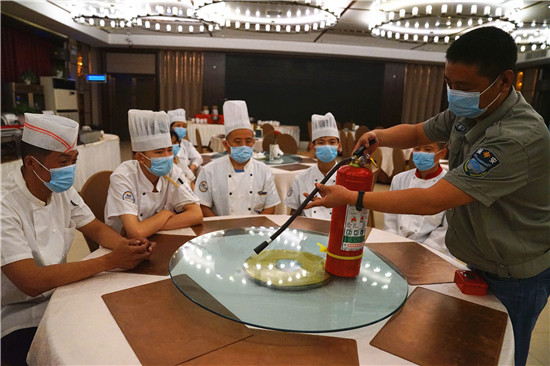 夏季來臨,消防安全成為大家關(guān)注的焦點(diǎn),為了消除隱患,防止安全事故發(fā)生,6月3日,周口飯店精心組織管理人員和員工開展消防應(yīng)急演練,提升消防應(yīng)急處置能力,預(yù)防各種事故發(fā)生。當(dāng)天,來自該飯店餐飲部及客房部40余名工作人員參加了演練。(記者 金月全 攝)