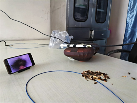 記者看到徐醫(yī)生自制的呼吸內(nèi)鏡,胸部是用一個(gè)家用電動(dòng)按摩枕代替的,用來(lái)能模擬人的胸部呼吸起伏;按摩枕上固定了兩個(gè)用打印紙卷成的小紙筒,用來(lái)代替氣管;屏幕是用手機(jī)代替的,用WIFI和氣管鏡鏈接,影像可以通過(guò)手機(jī)屏幕看到;內(nèi)鏡手柄是徐醫(yī)生用膠泥結(jié)合真實(shí)設(shè)備形狀、重量捏制而成的。當(dāng)著記者的面,徐醫(yī)生把一小半瓜子皮放入模擬人體氣管的紙筒,在手機(jī)屏幕的導(dǎo)航下通過(guò)氣管鏡到達(dá)異物所在位置,熟練地用異物鉗夾出異物。