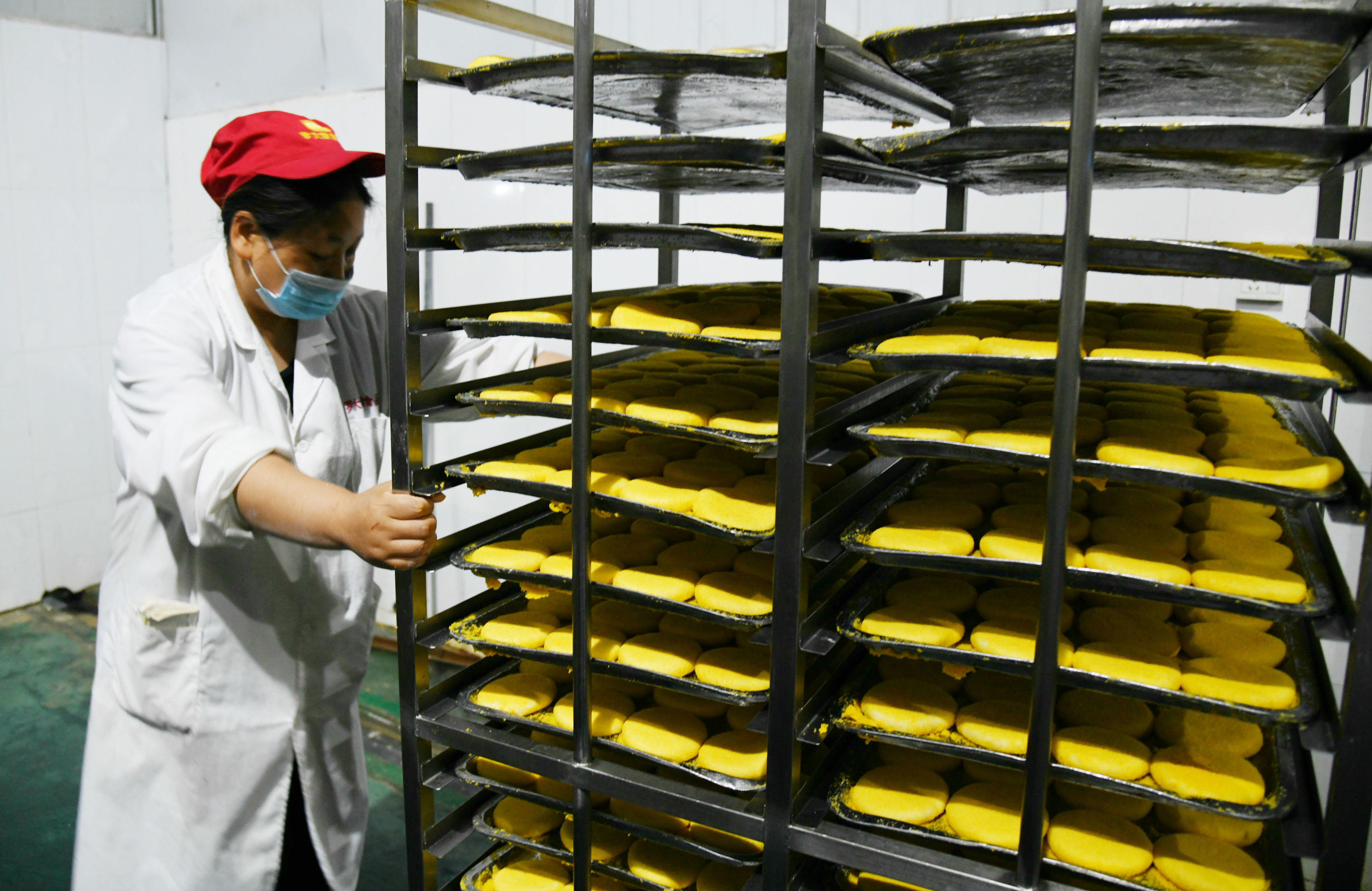 6月9日晚上,河南羅大娘食品有限公司員工在加班生產(chǎn)速凍糖糕。