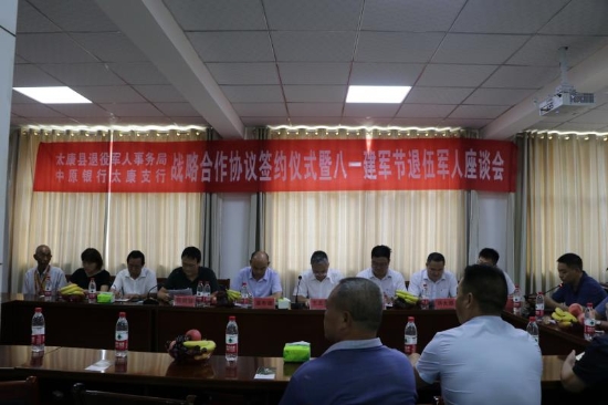 7月31日,太康縣退役軍人事務(wù)局與中原銀行太康支行舉行戰(zhàn)略合作協(xié)議簽約儀式,同時組織部分退役軍人召開了慶“八一”座談會?;顒佑赏艘圮娙耸聞?wù)局副局長張規(guī)劃主持。