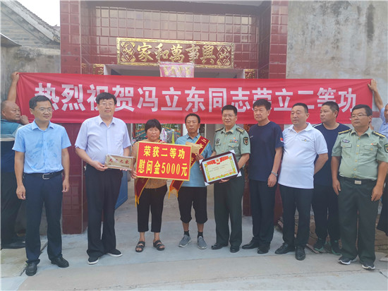 8月1日,淮陽區(qū)人武部負(fù)責(zé)人李保祥與該區(qū)退役軍人事務(wù)局局長(zhǎng)董天祥等人一起,帶著二等功喜報(bào)及慰問金,專程趕往該區(qū)四通鎮(zhèn)葉莊行政村前馮橋村現(xiàn)役軍人馮立東家中。此時(shí),村里鑼鼓隊(duì)敲響了,村民走出家門紛紛前來觀看,頓時(shí)贏得村民的一片喝彩及點(diǎn)贊聲。許多村民說:“孩子在部隊(duì)立功授獎(jiǎng),作為軍屬可真是光榮呀!”(記者孫安平 通訊員 張然 張航碩 攝影報(bào)道)