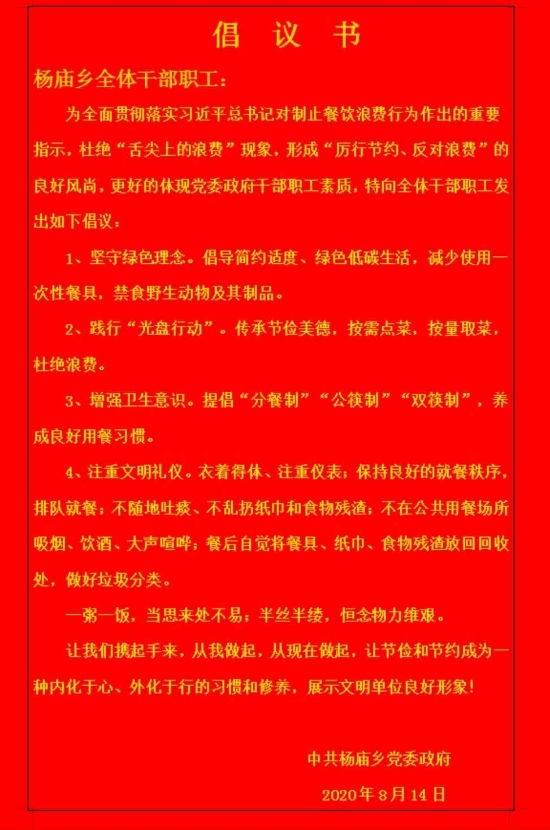據(jù)楊廟鄉(xiāng)黨委書記聶運(yùn)亨介紹,該鄉(xiāng)積極響應(yīng)總書記號召,向全鄉(xiāng)干部發(fā)出了堅(jiān)守綠色理念、踐行光盤行動(dòng)、增強(qiáng)衛(wèi)生意識、注重文明禮儀等四個(gè)方面的倡議,讓全鄉(xiāng)干部從我做起,從現(xiàn)在做起,使勤儉節(jié)約成為習(xí)慣和修養(yǎng)。