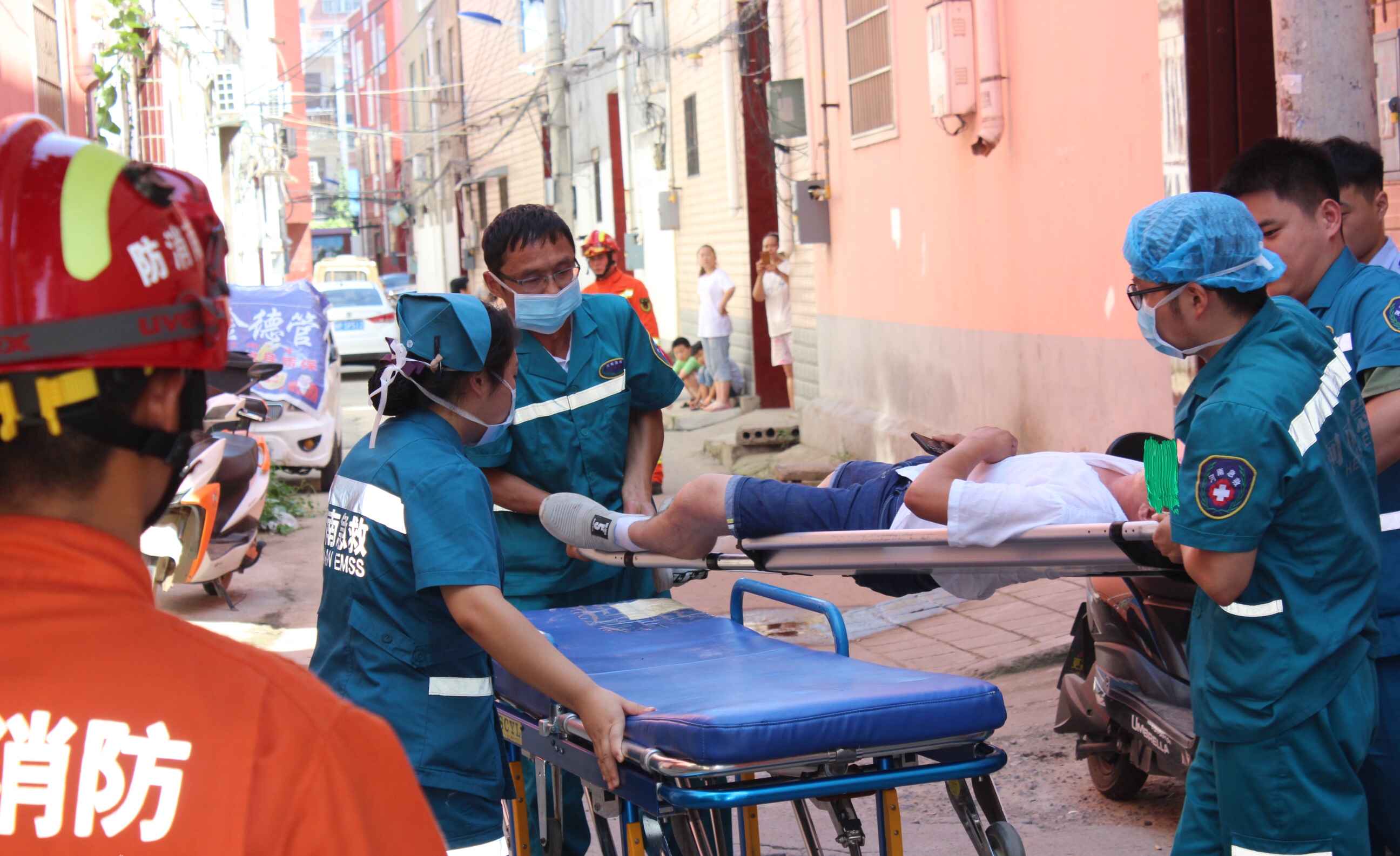 接到報警后,市公安局七一路分局民警、消防官兵、急救中心醫(yī)護人員迅速趕到現(xiàn)場?!安灰^來,再過來我就跳下去!”該女士在樓頂邊緣嘶吼著,當(dāng)日天氣比較炎熱,女子隨時都可能因體力不支而墜樓?,F(xiàn)場消防人員立即疏散圍觀人員,由于民房院內(nèi)面積較小,救生氣墊無法充起,給救援工作增加了難度,現(xiàn)場民警與消防隊員及時調(diào)整救援方法,先穩(wěn)住該女子情緒,伺機再將其救下。