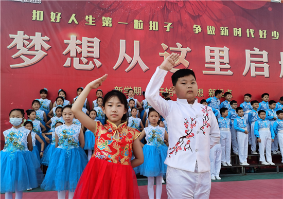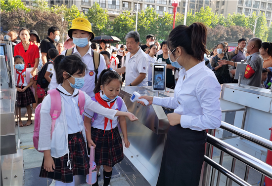 9月7日早上,周口市文昌小學(xué)的學(xué)生有序排隊(duì)測量體溫后進(jìn)入學(xué)校。據(jù)文昌小學(xué)校長介紹,全市中小學(xué)實(shí)行錯(cuò)峰開學(xué)。今天是小學(xué)開學(xué)時(shí)間,文昌小學(xué)學(xué)生每個(gè)年級(jí)實(shí)行錯(cuò)時(shí)上下學(xué),學(xué)生入校要測體溫,并為一年級(jí)新生舉辦了主題為“夢從這里啟航”的“迎新儀式”。