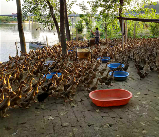 為了擴(kuò)大變蛋原料來源,她與當(dāng)?shù)丶巴獾囟嗉茵B(yǎng)雞企業(yè)簽訂訂單協(xié)議,滿足自己加工變蛋需要。為了滿足鴨蛋貨源,她在潁河灣一個支流處新建一個養(yǎng)鴨基地,目前養(yǎng)鴨5000余只,日產(chǎn)鴨蛋5000枚,基本滿足當(dāng)前加工咸鴨蛋需要。