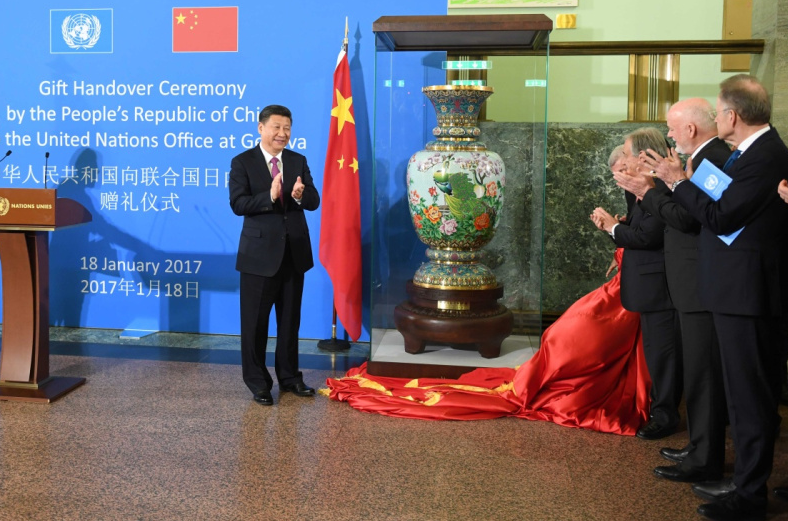 2017年1月18日,習近平主席出席中國向聯(lián)合國日內(nèi)瓦總部贈禮儀式。