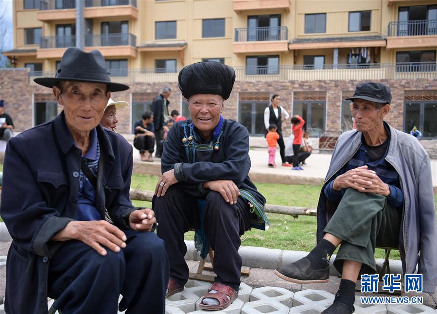 搬下山的人們,住進了有彝族傳統(tǒng)建筑風(fēng)格的新社區(qū),老人們常聚在街邊休閑(8月11日攝)。 新華社記者 李賀 攝