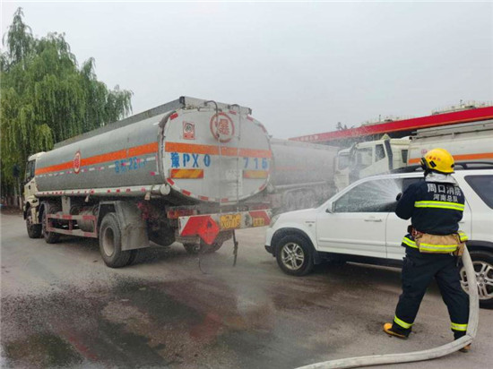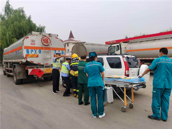 當(dāng)日上午10時,商水交警大隊指揮中心接到報警:在商水縣興商大道與陳勝大道交叉口西、湯莊油庫處,一輛轎車與一輛?;饭捃囎肺蚕嘧?,正常罐體損壞,?;沸孤镀鸹穑I車駕駛室變形,駕駛?cè)吮焕к噧?nèi),如不及時救援,駕駛?cè)擞猩kU,另外因事故現(xiàn)場臨近湯莊油庫,如不及時處置可能發(fā)生爆炸,后果不堪設(shè)想。