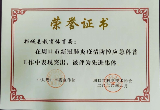 近日,市委宣傳部、市科協(xié)聯(lián)合表彰周口市新冠肺炎疫情防控應(yīng)急科普工作先進(jìn)集體和先進(jìn)個(gè)人,鄲城縣教體局被表彰為先進(jìn)單位,縣教體局副局長(zhǎng)劉廣鋒被表彰為先進(jìn)個(gè)人,為全縣教育系統(tǒng)疫情防控工作再添光彩。