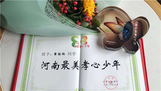 “正是天真爛漫的年紀,已有歷經(jīng)歲月的坦然。在苦難中成長,在風(fēng)雨中自強。寒門至孝,貧窮遮不住你內(nèi)心的光芒。嘗罷艱辛,方能破繭成蝶、百煉成鋼。你是‘河南最美孝心少年’——薛勝楠?!边@是組委會給薛勝楠的頒獎詞。
