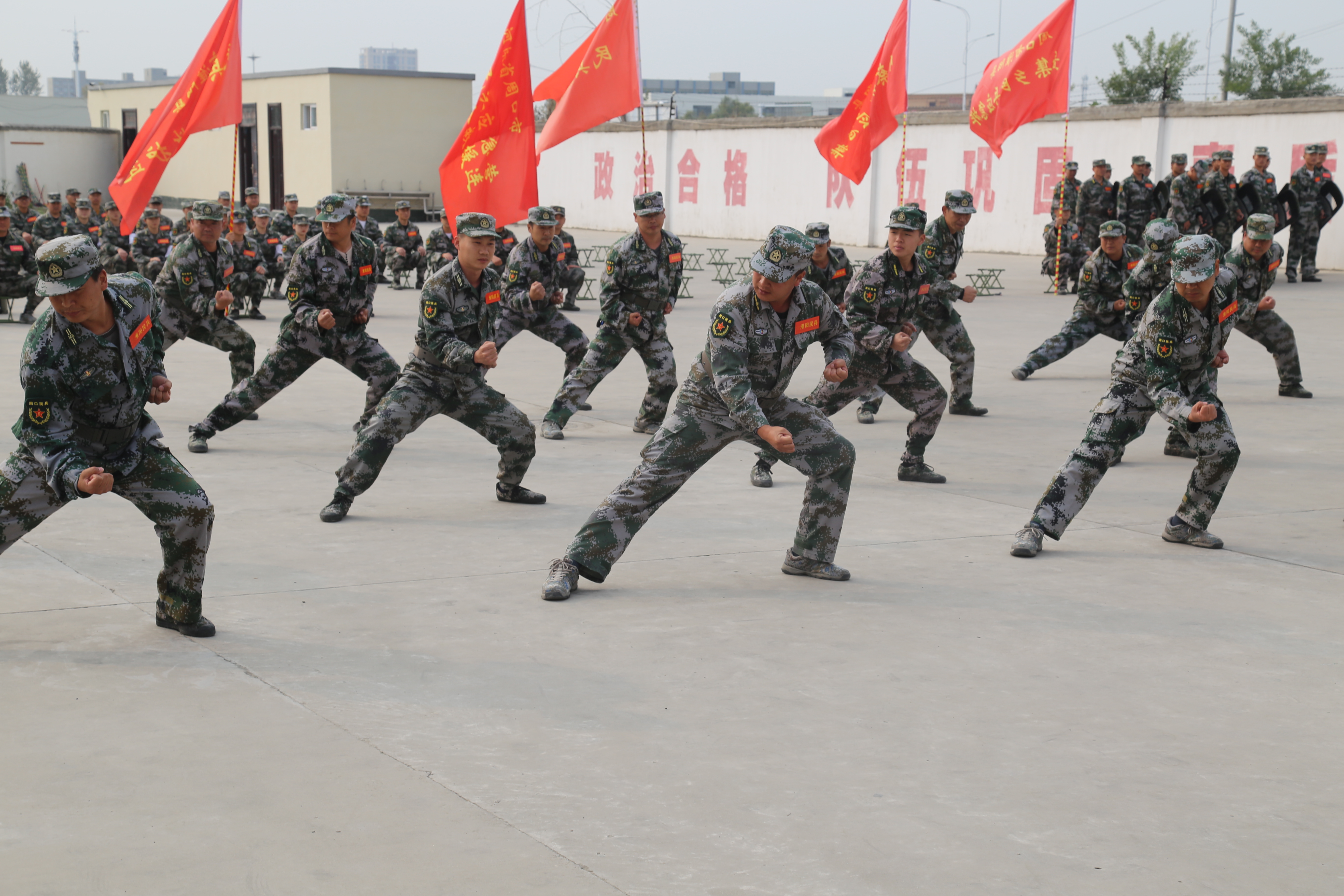 成果匯報現(xiàn)場,殺聲震天,紅旗招展。軍體拳、警棍盾牌操、戰(zhàn)場救護、摔擒訓練、單個軍人隊列動作、防爆隊形、隊形運動等訓練項目一一上演,每位民兵的一舉一動、一招一式,都展現(xiàn)了基干民兵“聽黨指揮、能打勝仗、作風優(yōu)良”的強軍目標,展現(xiàn)了大家召之即來、來之能戰(zhàn)、戰(zhàn)之必勝的優(yōu)良作風,受到了軍地領導的一致好評。