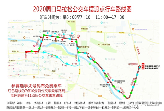 此外, 記者還從大賽組委會(huì)獲悉,2020周口馬拉松比賽公交車擺渡點(diǎn)行車路線圖也已公布,參賽選手憑號(hào)碼布可以免費(fèi)乘車,去時(shí)乘車路線為:文明路口——工農(nóng)路口——大慶路停車點(diǎn)——慶豐街——景園停車點(diǎn)——奧蘭停車點(diǎn)——公務(wù)員A區(qū)停車點(diǎn)——建業(yè)北門(mén)停車點(diǎn)周口大道——碧桂園停車點(diǎn)——堤頂北路——武盛大道——引黃調(diào)蓄風(fēng)景區(qū)門(mén)口擺渡車乘車起點(diǎn);回來(lái)時(shí)路線為:引黃調(diào)蓄風(fēng)景區(qū)——武盛大道——堤頂北路——碧桂園停車點(diǎn)——周口大道——慶豐街——建業(yè)北門(mén)停車點(diǎn)——公務(wù)員A區(qū)停車點(diǎn)——奧蘭停車點(diǎn)——景園停車點(diǎn)——大慶路停車點(diǎn)——七一路,其中班車運(yùn)行時(shí)間為早6:00至7:10,11:00至17:30。因場(chǎng)地受限,活動(dòng)當(dāng)天的停車區(qū)域分為兩處,一是引黃調(diào)蓄風(fēng)景區(qū)西門(mén)南北兩側(cè)便道;二是風(fēng)景區(qū)西門(mén)向南路西600米處東西無(wú)名路。
