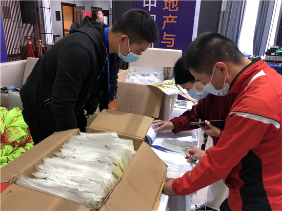 11月12日上午,記者在位于八一大道與文昌大道交叉口的佳利地產(chǎn)營(yíng)銷中心門(mén)口看到,今年由于疫情管控的需要,參賽選手領(lǐng)取裝備前需要先展示自己的健康碼,并配合醫(yī)護(hù)人員測(cè)量體溫,進(jìn)入現(xiàn)場(chǎng)還需戴口罩。在一樓活動(dòng)大廳,來(lái)自周口馬拉松協(xié)會(huì)的志愿者們先為選手確認(rèn)身份信息,再根據(jù)選手的身材、體型為其發(fā)放含有不同型號(hào)運(yùn)動(dòng)衣的背包。最終,每個(gè)參賽選手都會(huì)領(lǐng)到一個(gè)熒光綠色的小背包,里面裝有號(hào)碼布、參賽長(zhǎng)袖T恤、存衣包、手套、一次性風(fēng)雨衣和一本官方手冊(cè)等。
