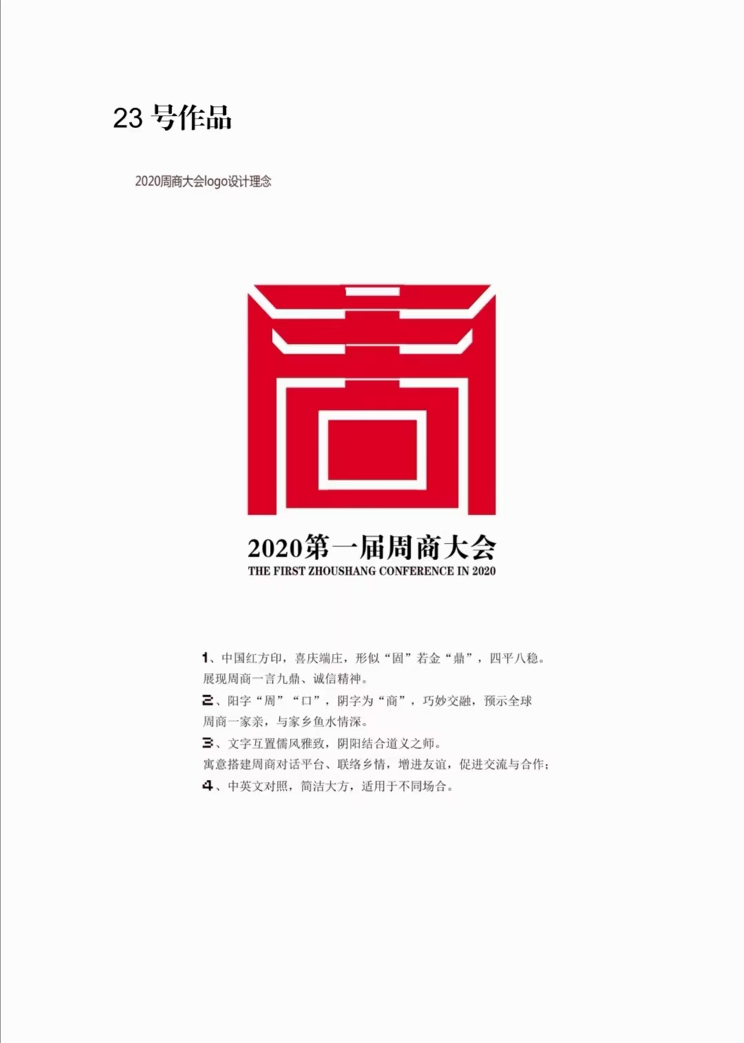 23號(hào)作品設(shè)計(jì)者沈湛向記者介紹了獲獎(jiǎng)作品的設(shè)計(jì)理念。作品采用中國(guó)紅,喜慶端莊,智圓行方,形似“固”若金“鼎”,四平八穩(wěn),展現(xiàn)了周商的志存高遠(yuǎn)、一言九鼎和誠信經(jīng)營(yíng)。同時(shí),陽字“周”“口”,陰字為“商”,巧妙交融,預(yù)示全球周商一家親,周商和家鄉(xiāng)魚水情深。再者,文字互置儒風(fēng)雅致,陰陽結(jié)合道義之師,寓意搭建周商對(duì)話平臺(tái),聯(lián)絡(luò)鄉(xiāng)情、增進(jìn)友誼,促進(jìn)交流與合作。最后,中英文對(duì)照,簡(jiǎn)潔大方,適用于不同場(chǎng)合。
