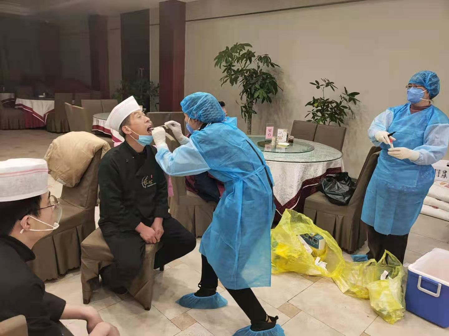 為助力第一屆周商大會(huì)圓滿成功,市衛(wèi)生健康委抽調(diào)近百名調(diào)精兵強(qiáng)將組成衛(wèi)生保障專(zhuān)班開(kāi)展衛(wèi)勤保障工作。圖為工作人員在市委黨校迎賓館和體育賓館餐廳對(duì)后廚人員做核酸檢測(cè)及開(kāi)展冷鏈?zhǔn)称废尽?/p>