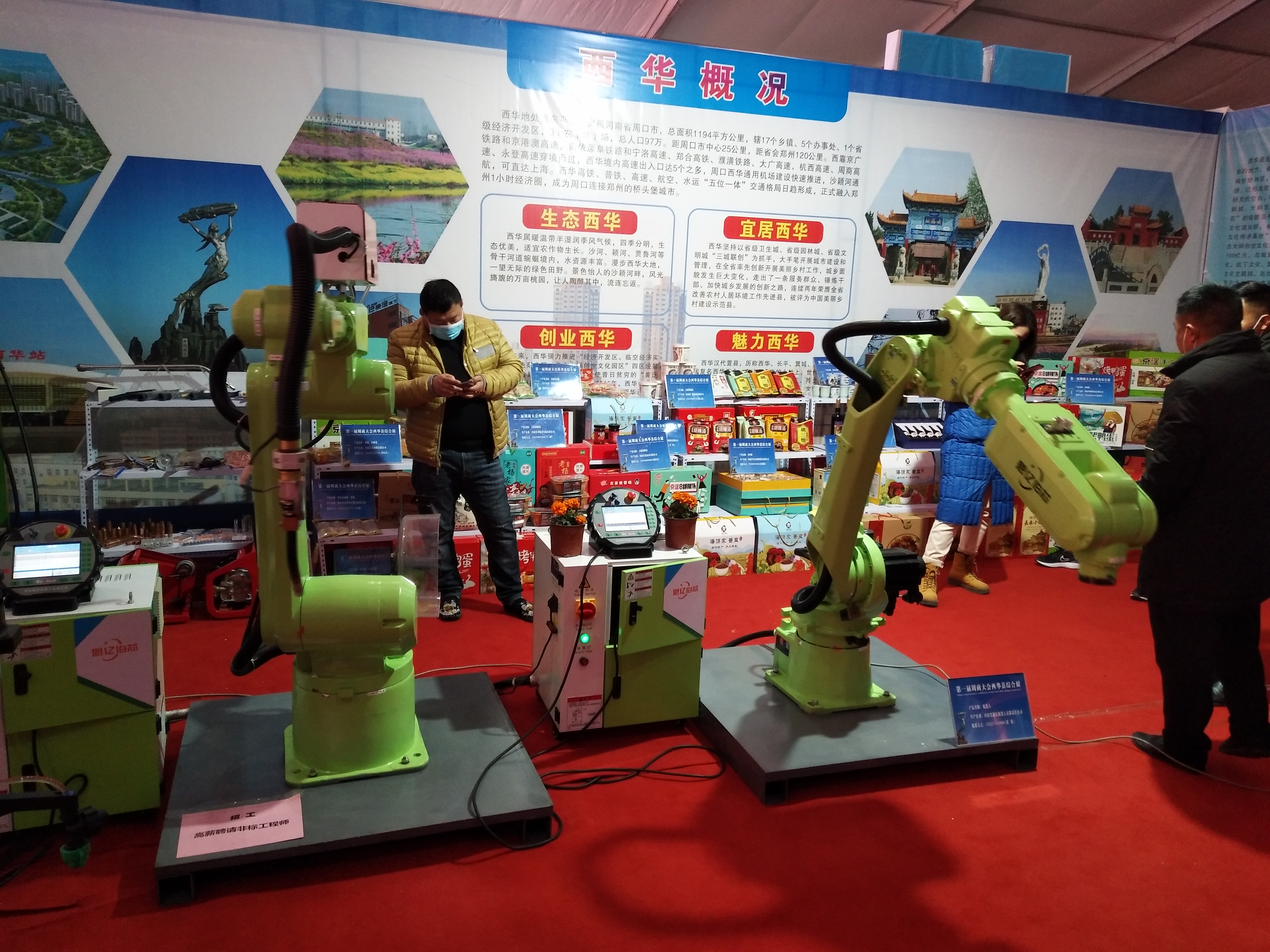 在西華縣展位,兩個(gè)高約1.5米、通體綠色的機(jī)械手臂,向來參觀的市民揮舞著“手掌”。這兩個(gè)機(jī)械手臂來自河南省恩億伯芯機(jī)器人有限公司,系西華縣本土企業(yè)自主研發(fā)。據(jù)董事長(zhǎng)劉濤介紹,展示的機(jī)械手臂里,帶防撞器的是焊接汽車等大型機(jī)械用的,另一個(gè)是碼垛搬運(yùn)用的,一次能搬運(yùn)20公斤重的貨物。該廠成立于2014年,與宇通、東風(fēng)日產(chǎn)等大型廠商有深度合作,所研發(fā)的工業(yè)機(jī)器人在大理和天津等地均有運(yùn)用。圍觀市民表示,若不是此次周商產(chǎn)品展示展覽會(huì),還真不知道周口有這些高科技企業(yè),希望周商的科技力量讓更多人看到。②8