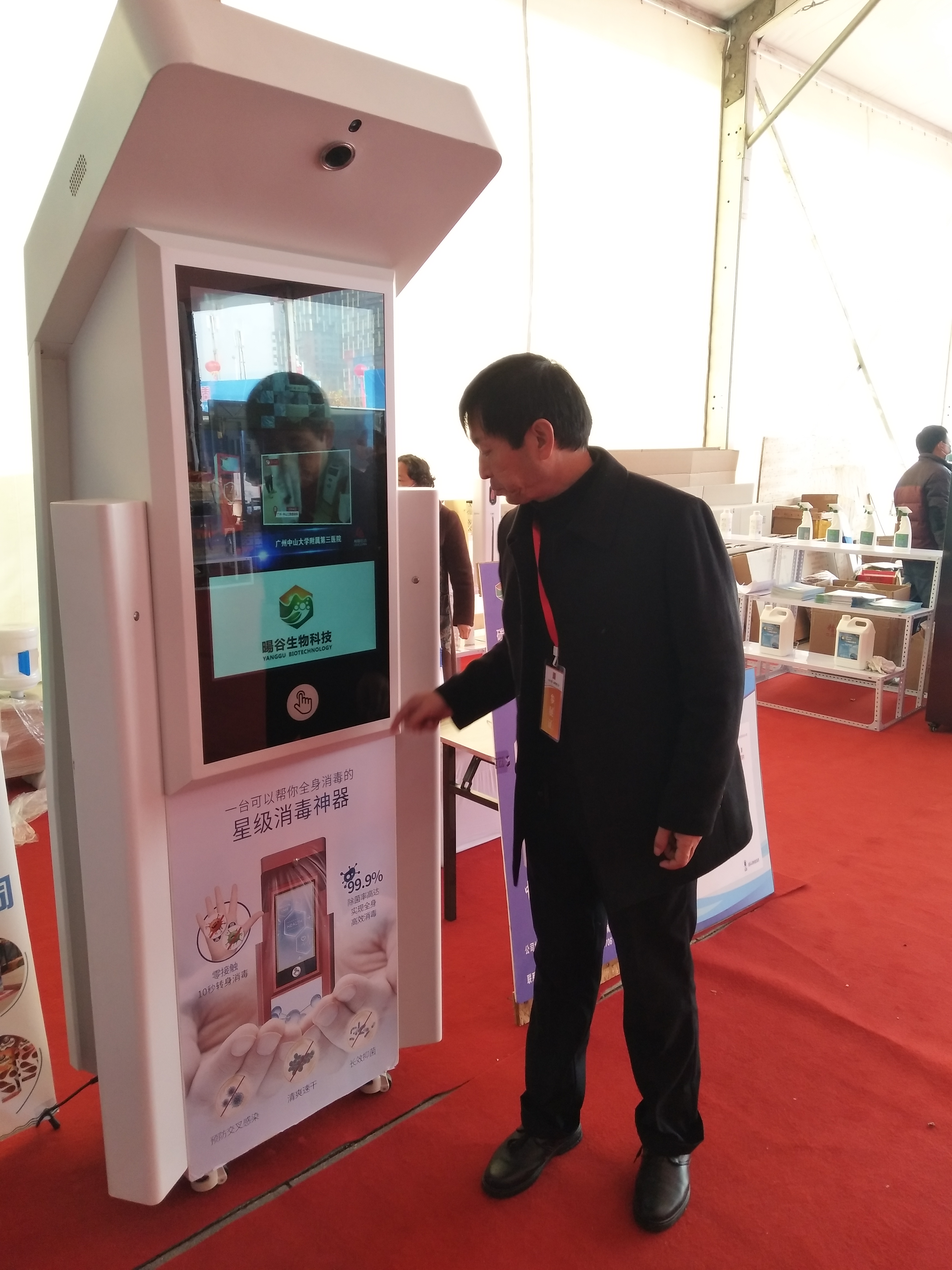 手掌往感控區(qū)上輕輕一罩,液晶屏四角就噴出霧化消毒液,大概持續(xù)10秒,足夠人轉(zhuǎn)一圈做周身消毒——在周商產(chǎn)品展示展覽大廳的西南角,北京陽谷生物科技有限公司市場(chǎng)部總監(jiān) 、項(xiàng)城人張清峰在介紹“人體感應(yīng)消毒機(jī)”,引得市民紛紛圍觀體驗(yàn)。由于消毒液沒有異味,部分市民質(zhì)疑是清水,對(duì)此張清峰說:“我們用的是‘竹芳牌’碳酸型微酸性次氯酸消毒液,我們的消毒機(jī)主要是面向校園推廣的,給孩子用的東西除了要有效,還得保證安全溫和,碳酸型的消毒液就沒有這么大的刺激性?!睋?jù)張清峰介紹,“人體感應(yīng)消毒機(jī)”是今年五月下旬生產(chǎn)的新品,目前處在推廣階段,“當(dāng)?shù)弥芸谝k第一屆周商大會(huì)的消息,我第一時(shí)間想到要把消毒機(jī)展示給家鄉(xiāng)父老。我是個(gè)在北京打拼十多年的項(xiàng)城人,目前河南分公司由我負(fù)責(zé),項(xiàng)城市政府給了我很多支持。”