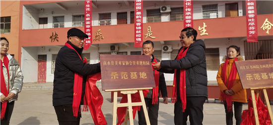 與會領(lǐng)導(dǎo)分別為“川匯區(qū)書畫院書法進校園示范基地”“商水縣書法家協(xié)會書法進校園示范基地”“商水縣美術(shù)家協(xié)會美術(shù)進校園示范基地”揭牌。中國書法家協(xié)會會員、中國作家協(xié)會會員、周口師范學(xué)院特聘教授張華中,周口市書法家協(xié)會副秘書長、川匯區(qū)文聯(lián)副主席游富華,以及我縣原政協(xié)副主席、商水縣美術(shù)家協(xié)會主席司新國,河南省書法家協(xié)會會員、文聯(lián)主席劉秋玲,中國書法家協(xié)會會員、商水縣書協(xié)主席趙世貴 ,中國美術(shù)家協(xié)會會員郭保同,河南省書法家協(xié)會會員關(guān)保證、王艷飛、沈曉虹,河南省美術(shù)家協(xié)會會員李飛等市縣知名書畫家向?qū)W校捐贈了墨寶。