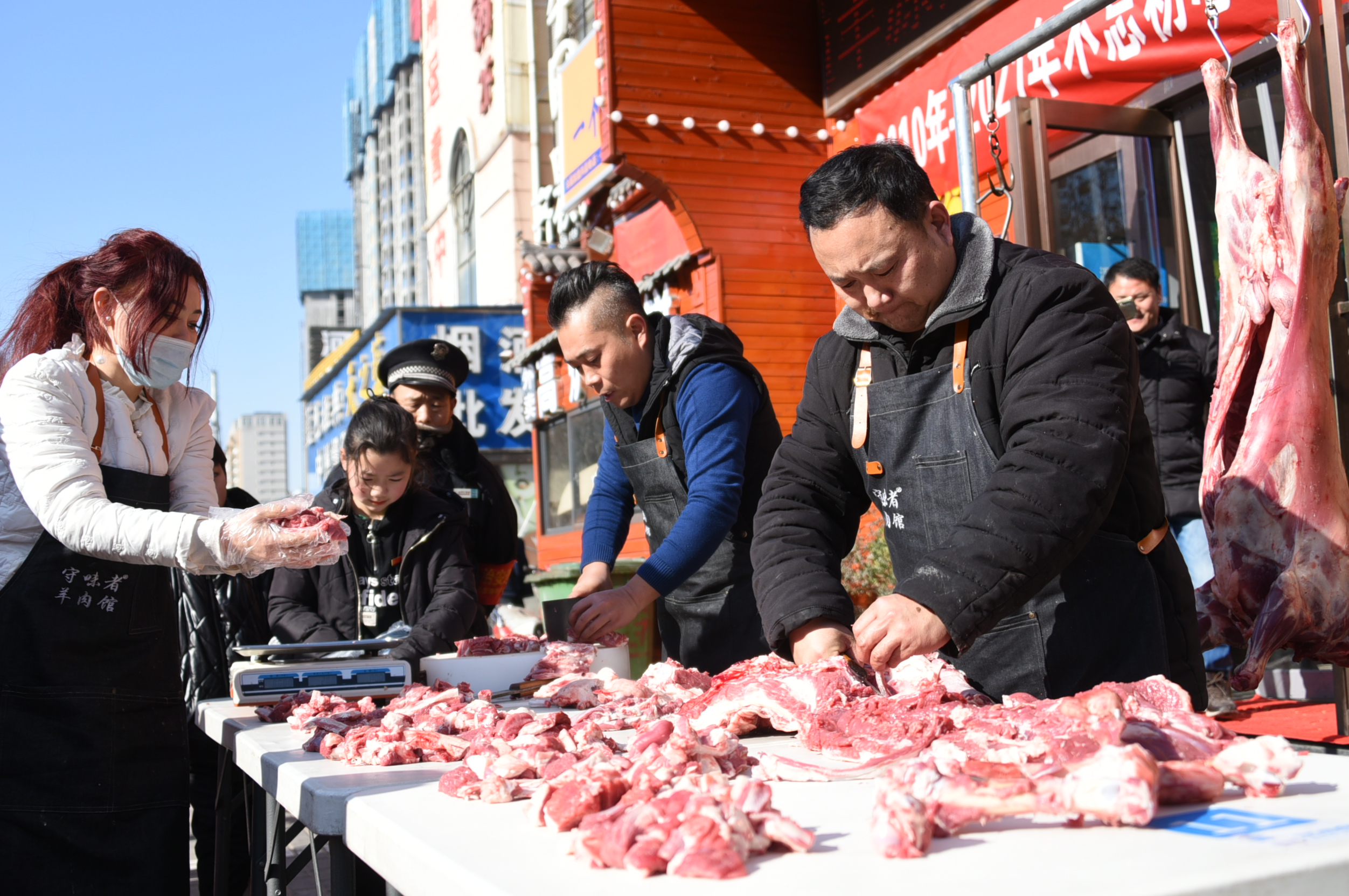 已經(jīng)連續(xù)11年為環(huán)衛(wèi)工人、殘疾人朋友、困難家庭派發(fā)愛心羊肉被大家稱之為“羊肉哥”的太康籍孫合理以及該店店老板的陳峰正在忙碌著將羊肉分割成小塊,孫合理的愛人劉曉愛、小女兒孫夢露也在一旁幫忙。
