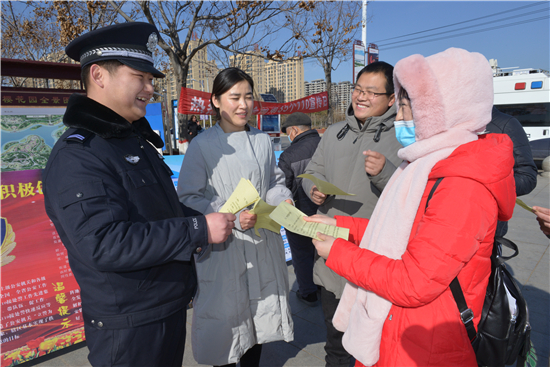 為迎接第35個“110宣傳日”的到來,1月9日,扶溝縣公安局組織民警在人民公園廣場開展“一心為民110,砥礪奮進新征程”為主題宣傳活動。民警通過現(xiàn)場發(fā)放宣傳資料、法律宣傳、警民互動等方式介紹110社會聯(lián)動常識,教群眾如何提升冬季安全防范知識,進一步密切警民關系。圖為民警向過往群眾發(fā)放宣傳資料。