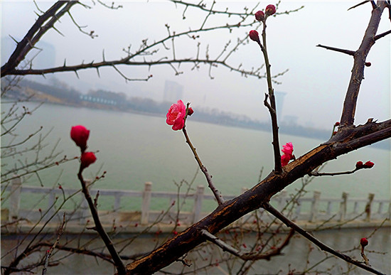 1月25日早晨,我市下了一場(chǎng)小雨。周口公園的梅樹(shù)上,幾朵梅花已經(jīng)綻放枝頭,被雨水滋潤(rùn)過(guò)后的梅花嬌艷,凝結(jié)在梅花上的小水珠晶瑩剔透,讓梅花變得別有一番詩(shī)意。