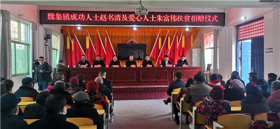 1月29日,天氣乍暖還寒,魏集鎮(zhèn)政府人頭攢動(dòng),喜氣洋洋,一片熱鬧的景象。內(nèi)蒙古希拉穆仁旅游置業(yè)開(kāi)發(fā)有限公司董事長(zhǎng)、內(nèi)蒙古楊子照明鋼桿制造有限責(zé)任公司董事長(zhǎng)、內(nèi)蒙古周口商會(huì)會(huì)長(zhǎng)趙書(shū)清和愛(ài)心人士朱富偉一行,帶著整整兩卡車(chē)米、面、油共計(jì)八萬(wàn)元生活物資,回到家鄉(xiāng)魏集鎮(zhèn)開(kāi)展扶貧濟(jì)困活動(dòng),在嚴(yán)寒的冬日給魏集鎮(zhèn)困難群眾帶來(lái)了溫暖和祝福??h政協(xié)主席孫培忠,縣委常委、宣傳部長(zhǎng)李本磊出席活動(dòng)。魏集鎮(zhèn)黨委書(shū)記衛(wèi)春忙,鎮(zhèn)長(zhǎng)劉艷光參加活動(dòng)。