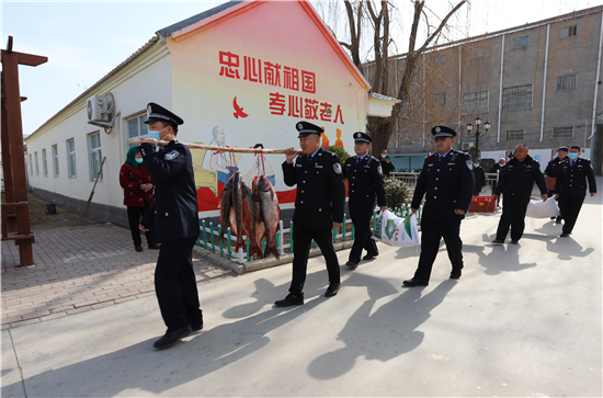 隨著春節(jié)日益臨近,該派出所所長(zhǎng)楊杰和大家商議,“送溫暖送祝?!被顒?dòng),應(yīng)該先從尊老愛(ài)幼開(kāi)始。于是,民警們購(gòu)買了60斤魚(yú)、100斤雞蛋和2袋面粉,利用中午休息時(shí)間來(lái)到敬老院,給老人們送上新春祝福。