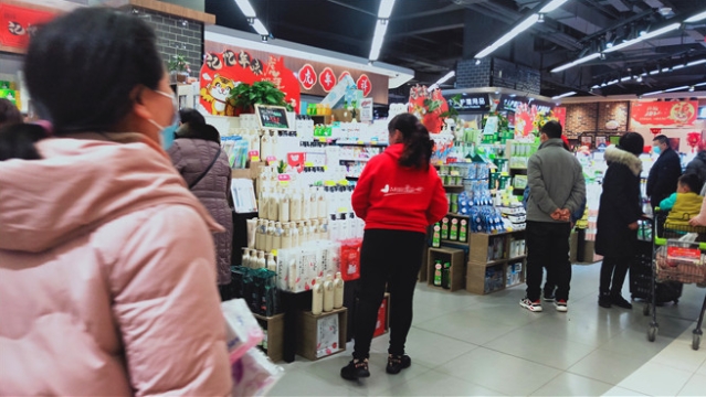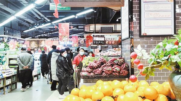 春節(jié)日益臨近,我市中心城區(qū)的各大超市充滿了濃濃的年味兒。1月26日,記者走進(jìn)一家超市看到,各類商品擺滿了貨架,糧油、糖品、干貨、生鮮、熟食、水果等品種豐富,一應(yīng)俱全,過年的氛圍十分濃厚。