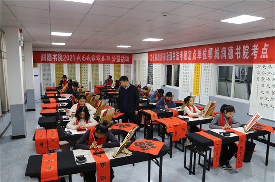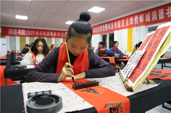 2月3日,記者在鄲城縣潤德書院看到,“我為我家寫春聯(lián)”活動(dòng)正緊張地進(jìn)行著,數(shù)十名書法小學(xué)員端坐案前、從容執(zhí)筆、揮毫作書,一個(gè)個(gè)福字工整又靈活,一副副對(duì)聯(lián)娟秀又詩意。孩子們?cè)谖輧?nèi)全神貫注地寫字,把最美好的祝福用自己的所學(xué)展示給家庭;家長們?cè)诖巴獾嗄_張望,望子成龍、望女成鳳的心態(tài)表露無遺。