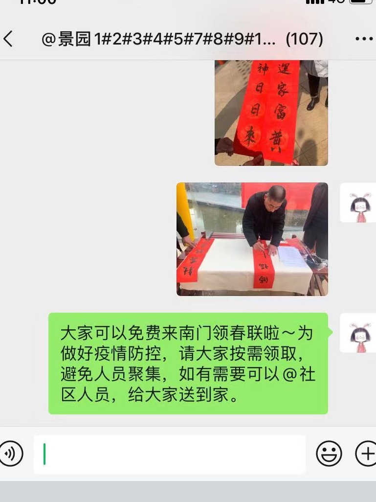 2月3日,為做好社區(qū)防疫工作,周口市城鄉(xiāng)一體化示范區(qū)景園社區(qū)一改往年現(xiàn)場(chǎng)寫(xiě)、集中送的免費(fèi)送春聯(lián)活動(dòng)形式,把“寫(xiě)春聯(lián)”與“送春聯(lián)”分開(kāi),通過(guò)微信群向社區(qū)居民展示書(shū)法愛(ài)好者的春聯(lián)作品,讓居民在線挑選,按需有序領(lǐng)取,避免人群聚集。同時(shí),針對(duì)社區(qū)老年人等行動(dòng)不便群體,主動(dòng)送春聯(lián)上門,確保送“?!迸c防疫兩不誤。
