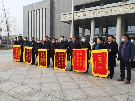 2月4日下午,淮陽區(qū)康森木業(yè)有限公司、周口裕彩科技研發(fā)有限公司等6家企業(yè)代表為區(qū)優(yōu)化營(yíng)商環(huán)境專項(xiàng)治理工作組送來了6面錦旗和大量防疫物資,向工作組表達(dá)感激之情,對(duì)工作組人員高效快捷的工作給予高度贊揚(yáng)。