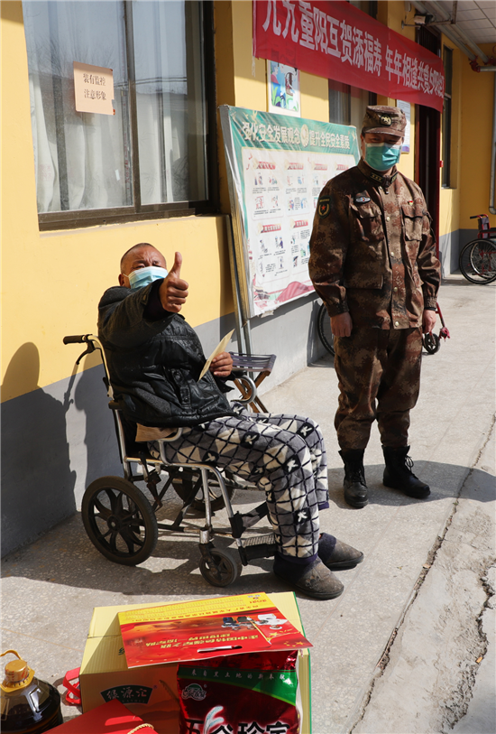 新橋鎮(zhèn)新兵楊凱入伍前和癱瘓的父親相依為命,市人武部領(lǐng)導(dǎo)協(xié)調(diào)地方政府,把其父親送到了新橋鎮(zhèn)敬老院公費(fèi)養(yǎng)老,解除他的后顧之憂。春節(jié)到了,人武部領(lǐng)導(dǎo)還牽掛著這個(gè)特困家庭,矯百成帶隊(duì)來(lái)到新橋鎮(zhèn)敬老院。此時(shí)正值中午,楊凱的父親正坐在屋外的輪椅上曬太陽(yáng),見(jiàn)到矯部長(zhǎng)的突然到來(lái),激動(dòng)的眼含熱淚,他緊緊握住矯百成的手久久不愿松開。矯百成噓寒問(wèn)暖,給他送上1000元慰問(wèn)金和生活必需品,楊凱的父親用他那不太清晰的語(yǔ)言表達(dá)對(duì)部長(zhǎng)的真誠(chéng)感謝。在敬老院院長(zhǎng)的帶領(lǐng)下,矯百成又來(lái)到老人的住室察看起居情況,詢問(wèn)他平時(shí)生活狀況,當(dāng)?shù)弥先松畹暮苁娣r(shí),矯百成滿意的笑了。
