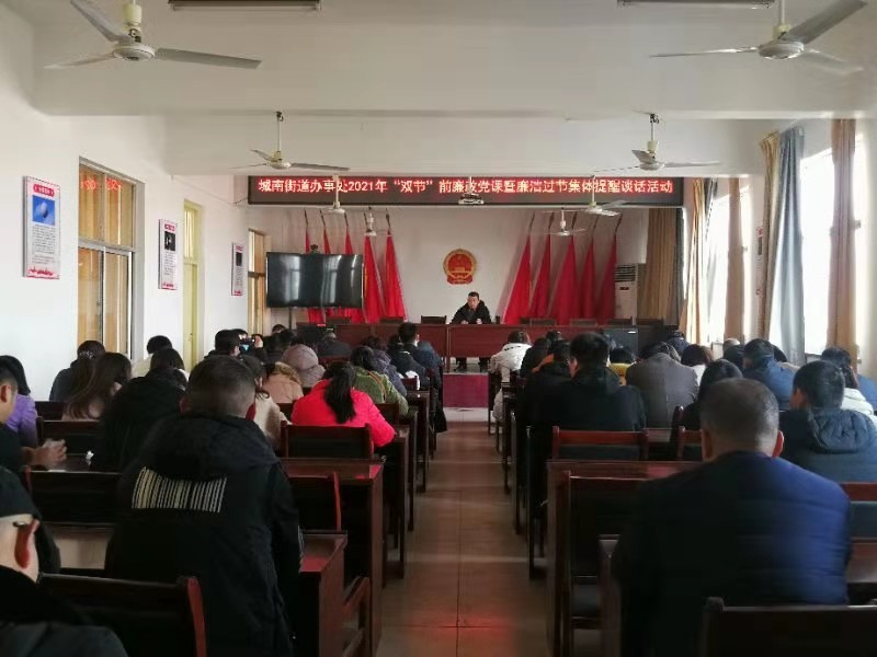 在春節(jié)、元宵節(jié)即將來臨之際,川匯區(qū)城南街道辦事處開展2021年“雙節(jié)”前廉政黨課暨廉潔過節(jié)集體談話活動,要求黨員干部增強(qiáng)廉潔自律意識、筑牢思想防線,確保過一個風(fēng)清氣正的“雙節(jié)”。