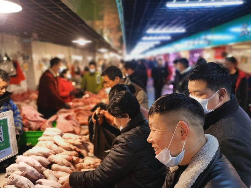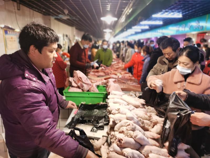 2月10日一大早,位于周口市的最大的黃淮農(nóng)貿(mào)市場(chǎng)里熙熙攘攘,熱鬧豐常,行人小心翼翼地從來(lái)往的各式貨車(chē)間穿過(guò),客商們被格外熱鬧的攤位吸引,駐足詢(xún)價(jià)、了解行情。圖為熱鬧的肉類(lèi)銷(xiāo)售區(qū)域內(nèi)市民在選購(gòu)。
