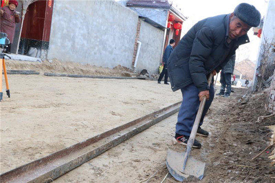 村里找來工程隊(duì)立即開始動工修路,群眾自發(fā)來幫忙?!按謇锎蠼中∠锶啃奚狭怂嗦?,這是幾十年來最大的喜事!”李知中邊干活邊笑著說,“我身子骨還算硬朗,就主動過來干些力所能及的活,現(xiàn)在全村1500多米的大街小巷即將開始澆筑水泥,修好后給全村帶來了很大的便利,很感激村委領(lǐng)導(dǎo)為群眾辦實(shí)事。”