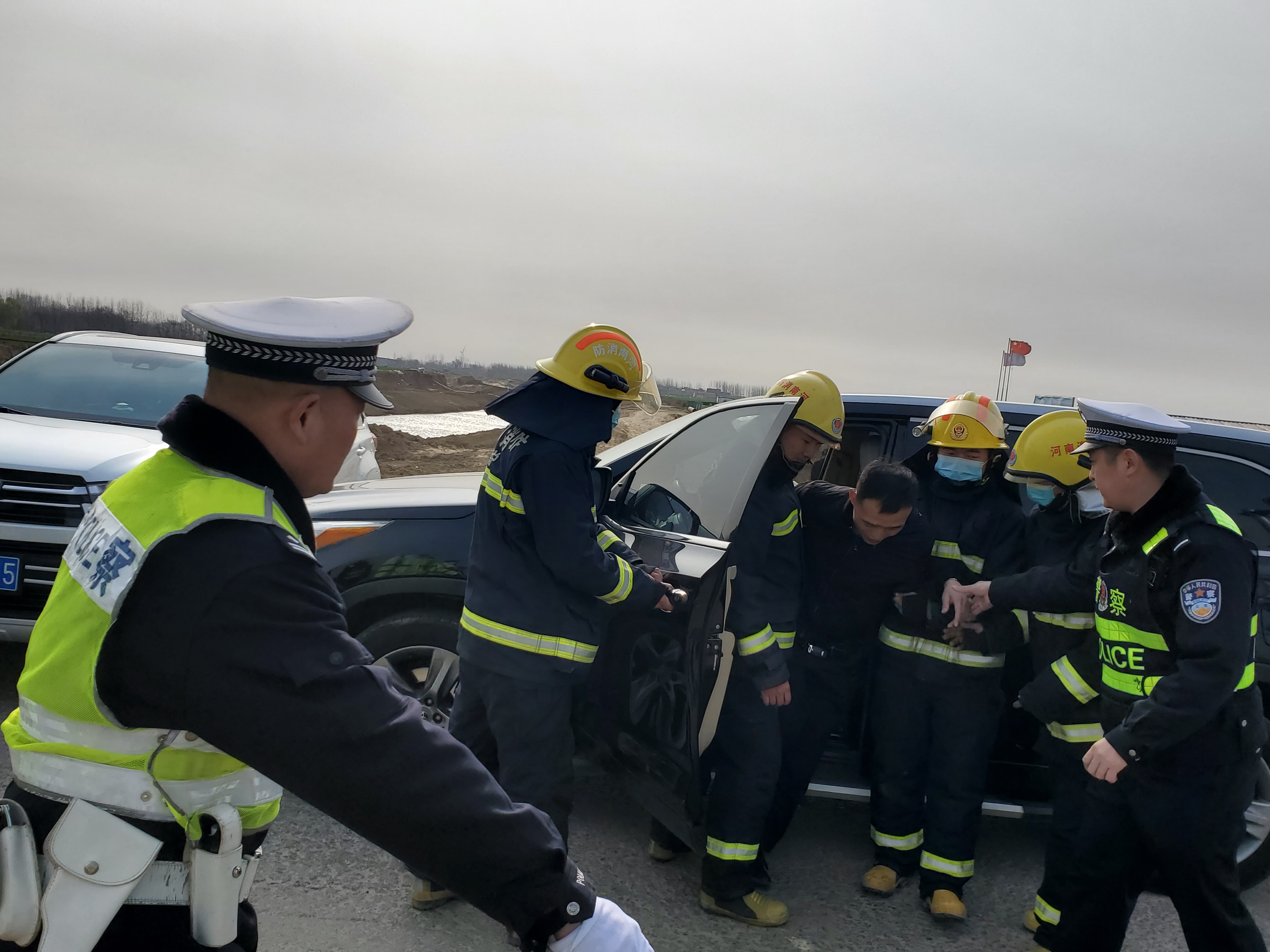 演練模擬2月23日10許,在G220國道河南安徽二省交界友誼橋處,二輛越野車在道路中心線處相撞,二輛車駕駛?cè)祟^部受傷流血,車門被卡,車輛起火冒煙道路嚴重擁堵、情況危急。接到報警后,交警部門立即向上級進行匯報,“四位一體”聯(lián)動工作機制隨即啟動,相關(guān)部門迅速趕往現(xiàn)場開展事故處置和救援工作。同時會同交警、屬地派出所,消防救援、醫(yī)療救護部門一起協(xié)助開展相關(guān)工作。隨后事故民警按照現(xiàn)場勘查要求,迅速對現(xiàn)場進行勘查、拍照,提取相關(guān)證據(jù),配合搶險、醫(yī)療施救各部門,并對現(xiàn)場遺留物品進行清理、登記并妥善保管??辈榻Y(jié)束后交警部門解除警戒區(qū),將車輛疏導(dǎo)、分流完畢后撤離現(xiàn)場。